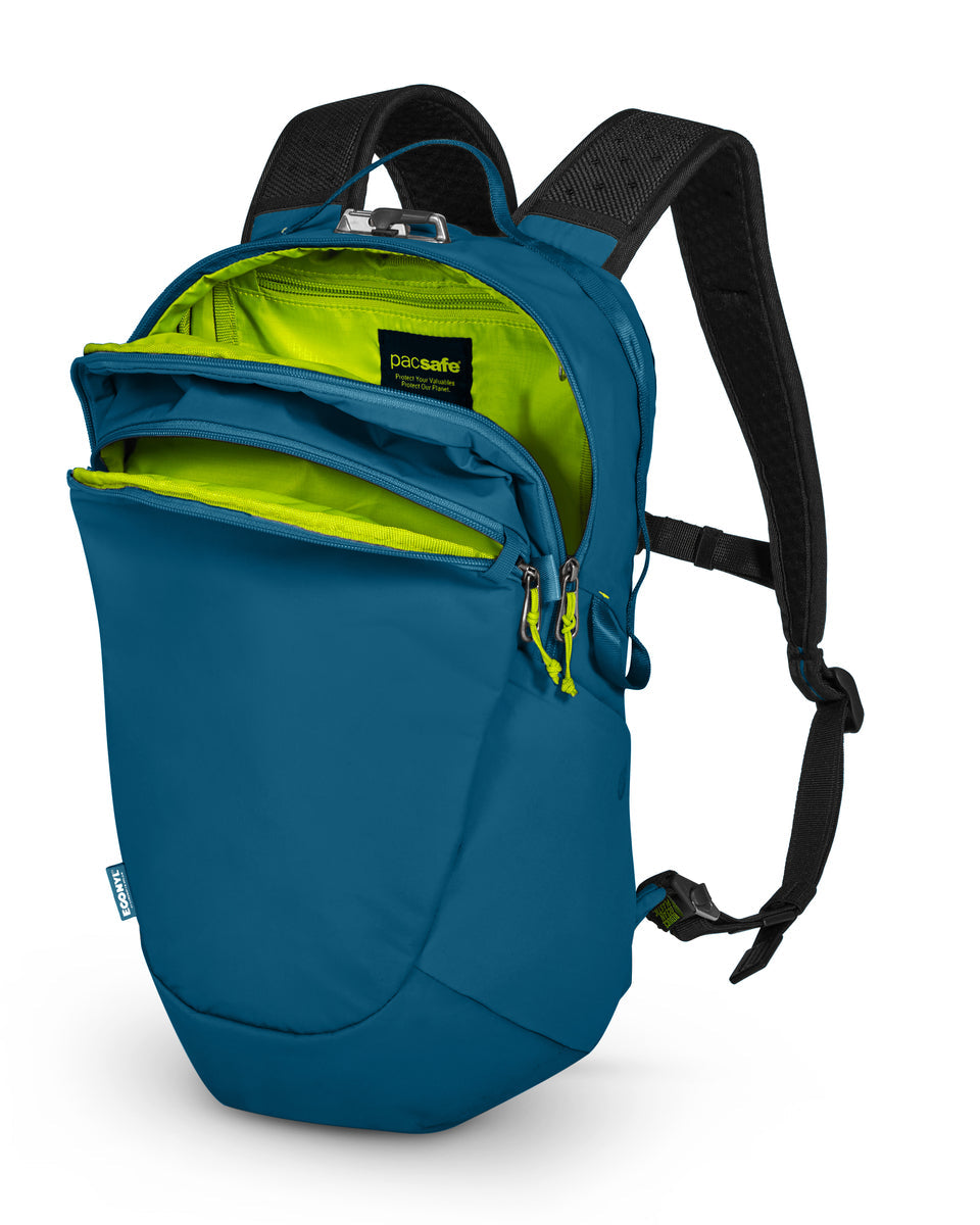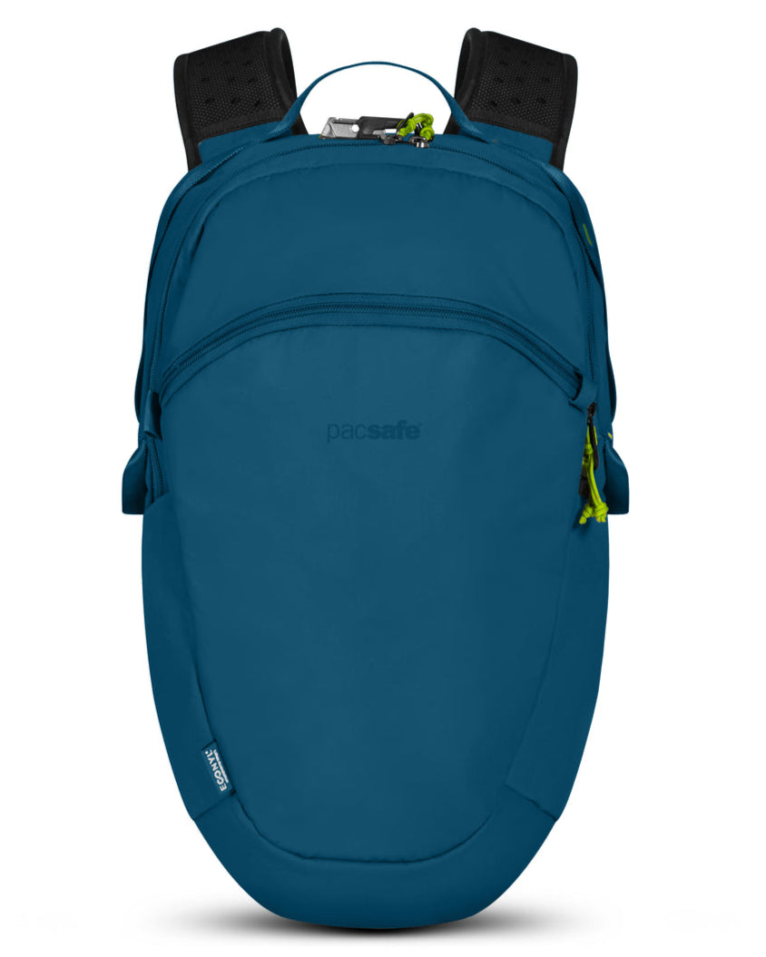 The Pacsafe ECO collection is our most sustainable collection yet by using almost 100% recycled materials and components. When you need something compact yet spacious for a day trip or hike, this 18L backpack is your new go-to. The lightweight design has plenty of room with multiple pockets and compartments to organize your essentials. Other features include a breathable mesh panel that is ergonomically designed to support your back and to create excellent airflow to keep you dry. The ergonomically-designed shoulder straps offers better support and carrying comfort. Stay hydrated on the move with two large water bottle pockets and a compartment for a water bladder or laptop. Made with 10 recycled plastic bottles, which were used in the lining, mesh, webbing, and labels. The outer shell fabric and certain buckles were made with ECONYL® regenerated nylon, which comes from waste such as discarded fishing nets, fabric scraps, carpets and industrial plastic.