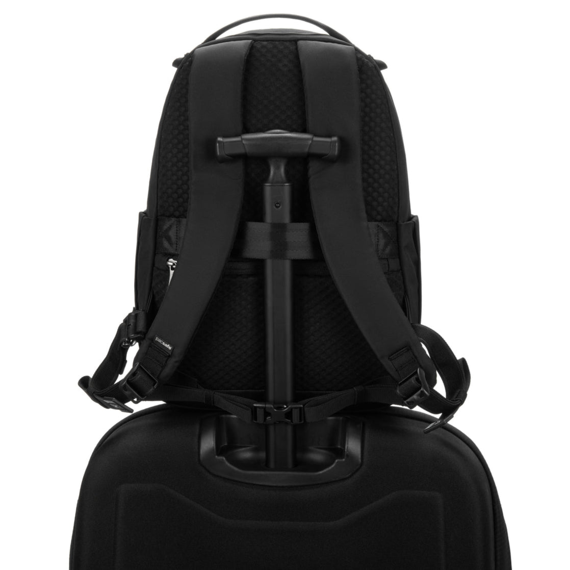 Compact yet highly organized, this 16L anti-theft backpack is designed to securely carry your day trip essentials. It features two lockable compartments, each equipped with internal organization pockets to ensure everything stays neatly arranged. Additionally, the backpack includes a padded laptop sleeve designed to accommodate a 13" MacBook, providing extra protection for your device. For added convenience, the backpack includes a hidden pocket on the back to safely store important items such as your phone, providing easy access whenever needed. It also features a luggage slip, allowing you to securely attach the backpack to the handle of your wheeled luggage.
