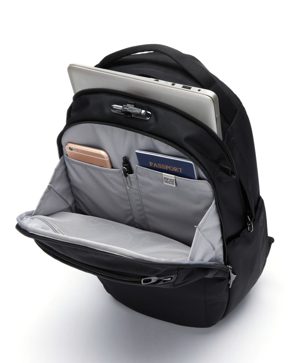 - Slashproof Carrysafe® strap is an adjustable backpack strap with flexible, lightweight intergrated wire