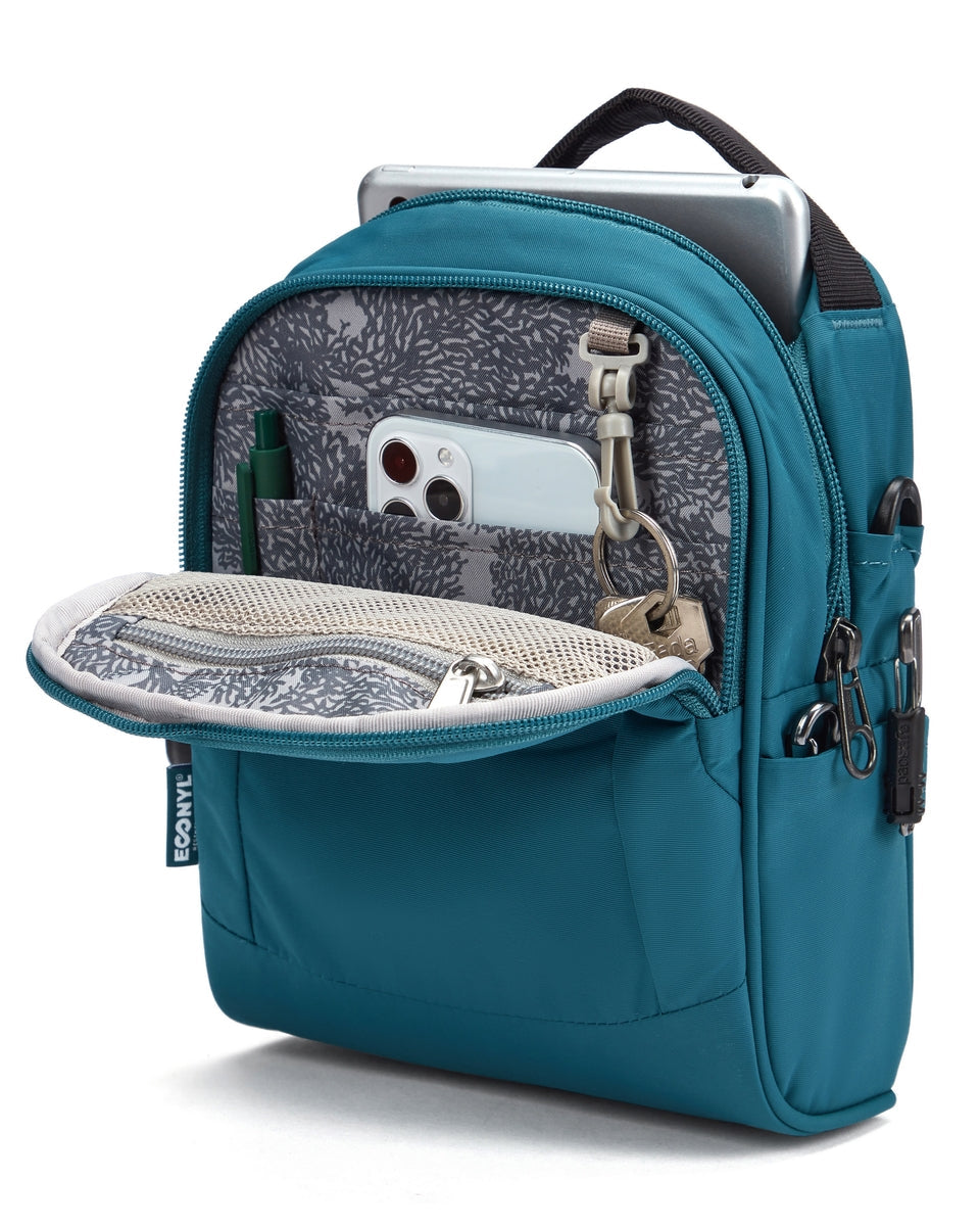 Protect your valuables and our planet in this classic, everyday crossbody made with ECONYL® regenerated nylon. With room for an 8-inch tablet, passport, wallet, keys and organization to keep everything sorted, it’s all protected by anti-theft tech like zipper security and RFID blocking pockets.