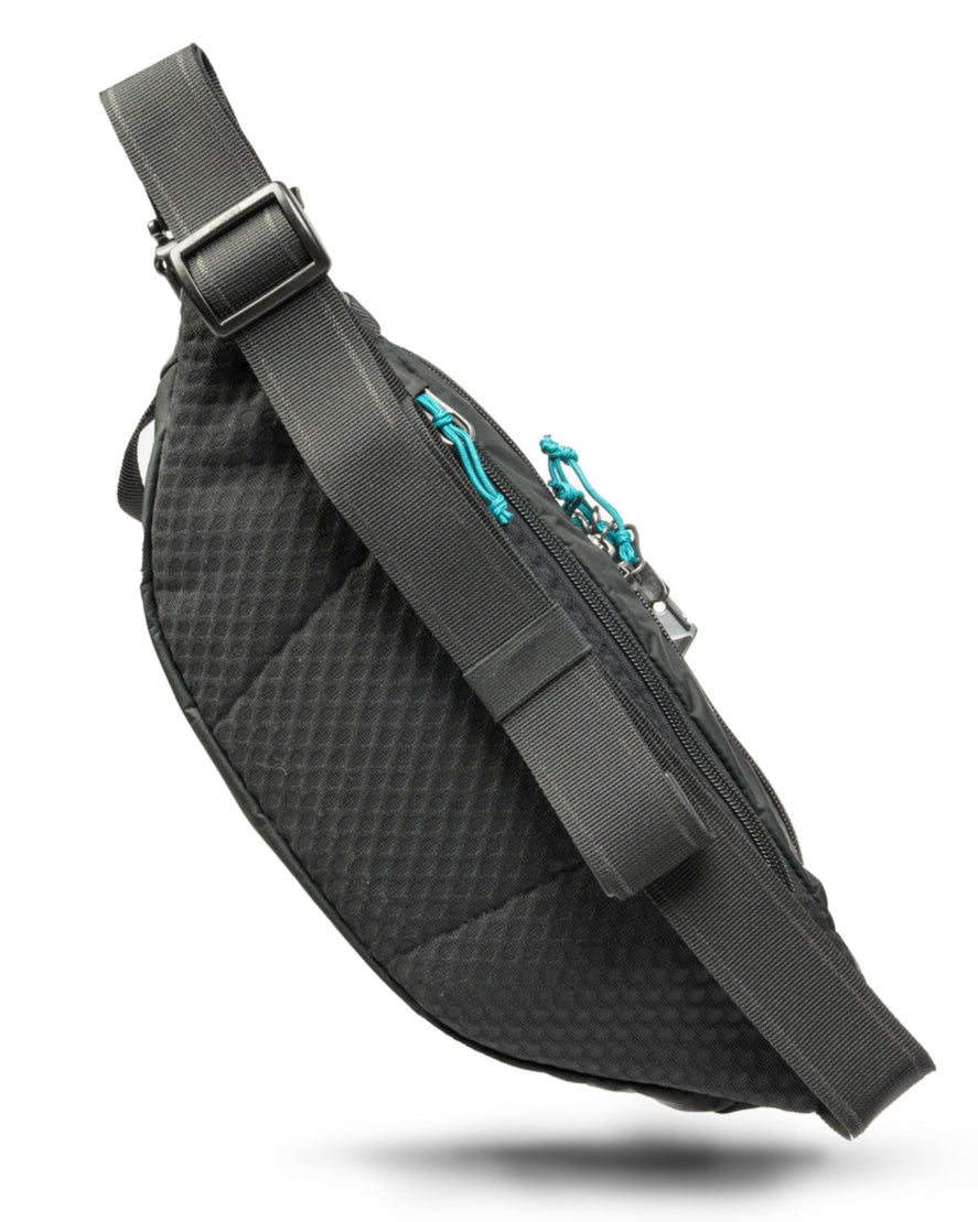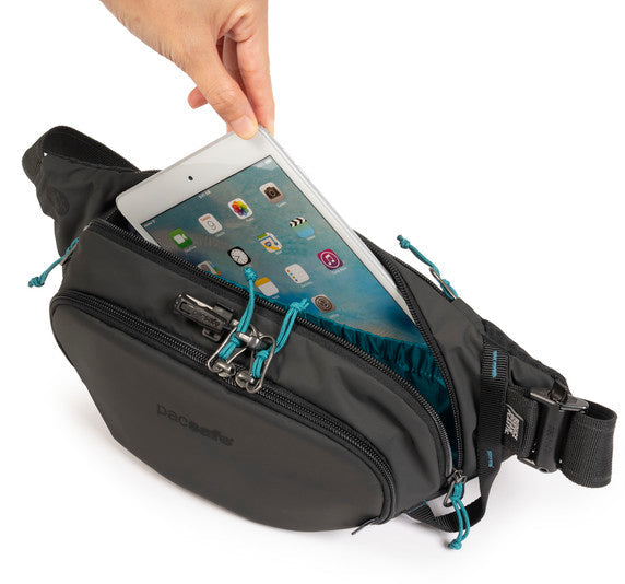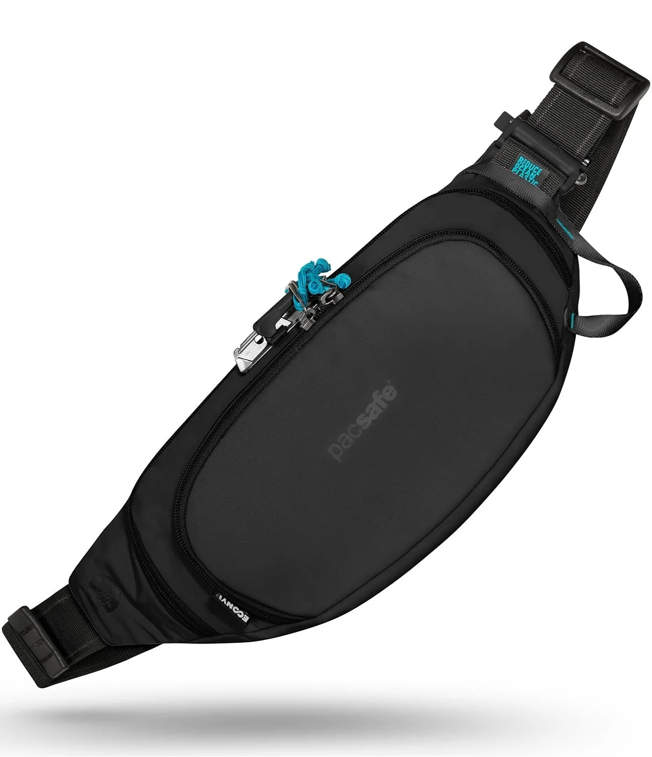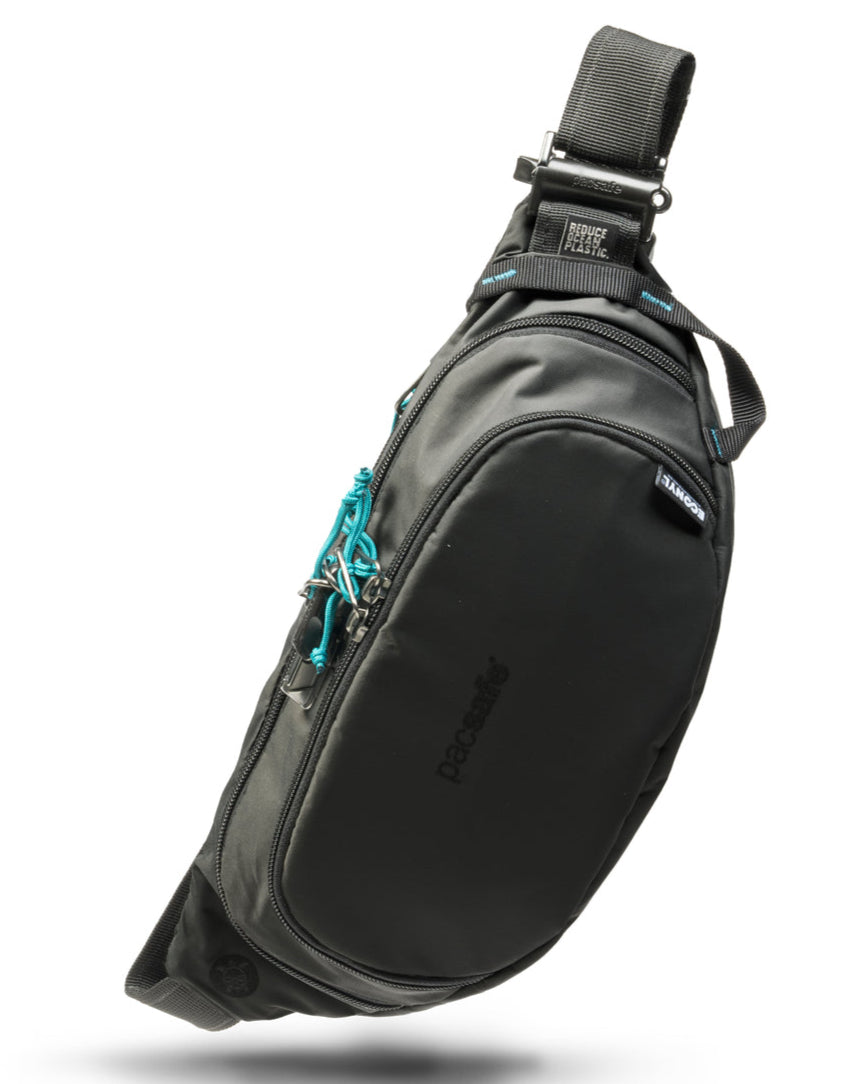 The Pacsafe ECO collection is our most sustainable collection yet by using almost 100% recycled materials and components. Get quick access to your essentials when you're on-the-go with this spacious and ultra-organized waist pack. Whether you prefer to wear this waist pack across your body or embrace the old-school style and wear it around your hips, you'll love wearing this bag on hikes, runs, rides, traveling, and other adventures. Keep your valuables safely hidden away with a secret pocket on the back. Made with 6 recycled plastic bottles, which were used in the lining, mesh, webbing, and labels. The outer shell fabric and certain buckles were made with ECONYL® regenerated nylon, which comes from waste such as discarded fishing nets, fabric scraps, carpets and industrial plastic.