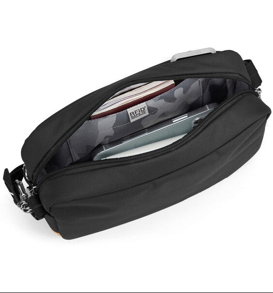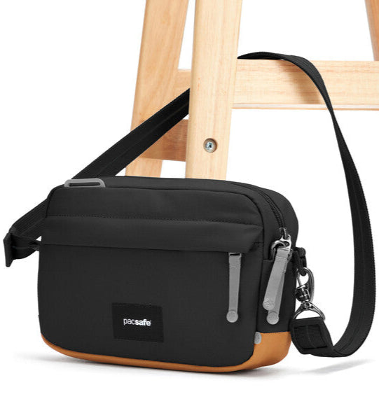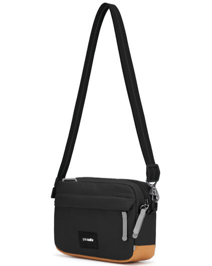 This compact crossbody goes with any outfit and carries all the essentials—phone, wallet, sunglasses and even a 7-inch tablet – making it a perfect on-the-go option. This crossbody features cut-resistant materials and strap, securable zippers, and an RFID blocking pocket. Our GO collection unlocks adventure and possibility with anti-theft security and effortless function. Made from 7 recycled plastic bottles.