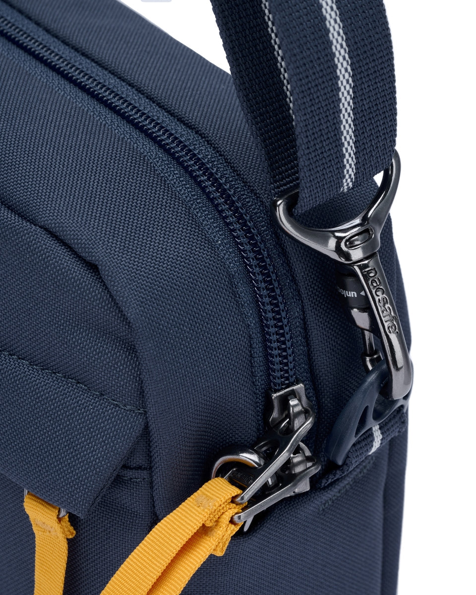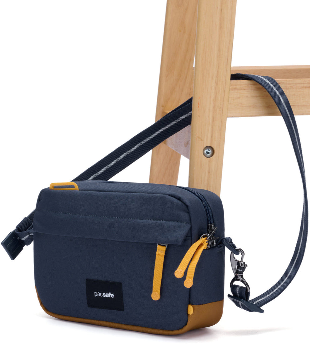 This compact crossbody goes with any outfit and carries all the essentials—phone, wallet, sunglasses and even a 7-inch tablet – making it a perfect on-the-go option. This crossbody features cut-resistant materials and strap, securable zippers, and an RFID blocking pocket. Our GO collection unlocks adventure and possibility with anti-theft security and effortless function. Made from 7 recycled plastic bottles.