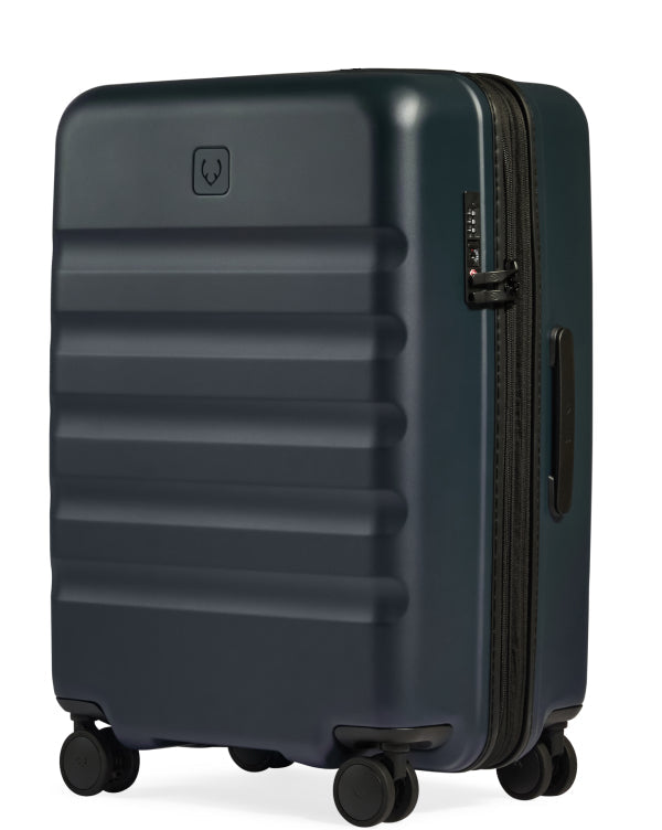 Icon Stripe range made of recycled polycarbonate. Strong shell protects items during travel. Expandable for souvenirs. Silent Glide 360 wheels and comfort-grip handle for easy movement. Spacious recycled interior lining with pockets and straps.