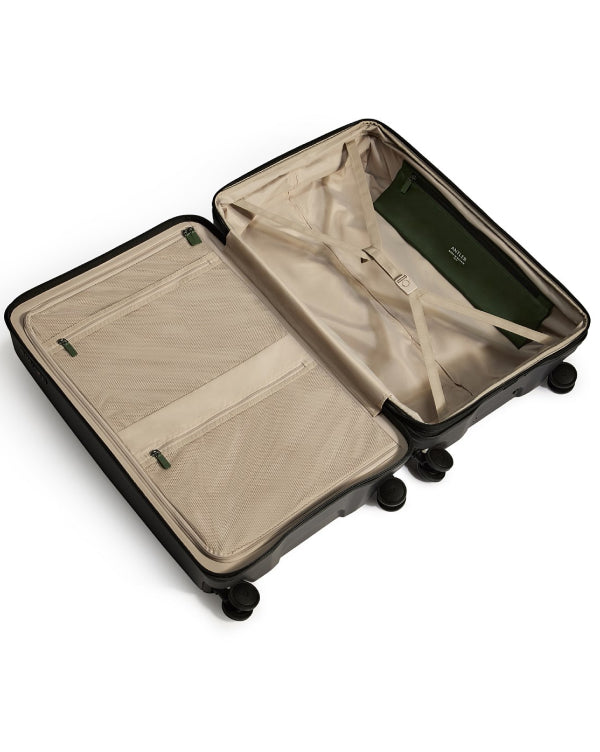 Experience unrestricted movement with our design combination of Silent Glide 360 spinner wheels and bespoke comfort-grip handle. The compact yet spacious fully recycled interior lining, featuring double-zip pockets and compression straps, provides ample space for your belongings.
