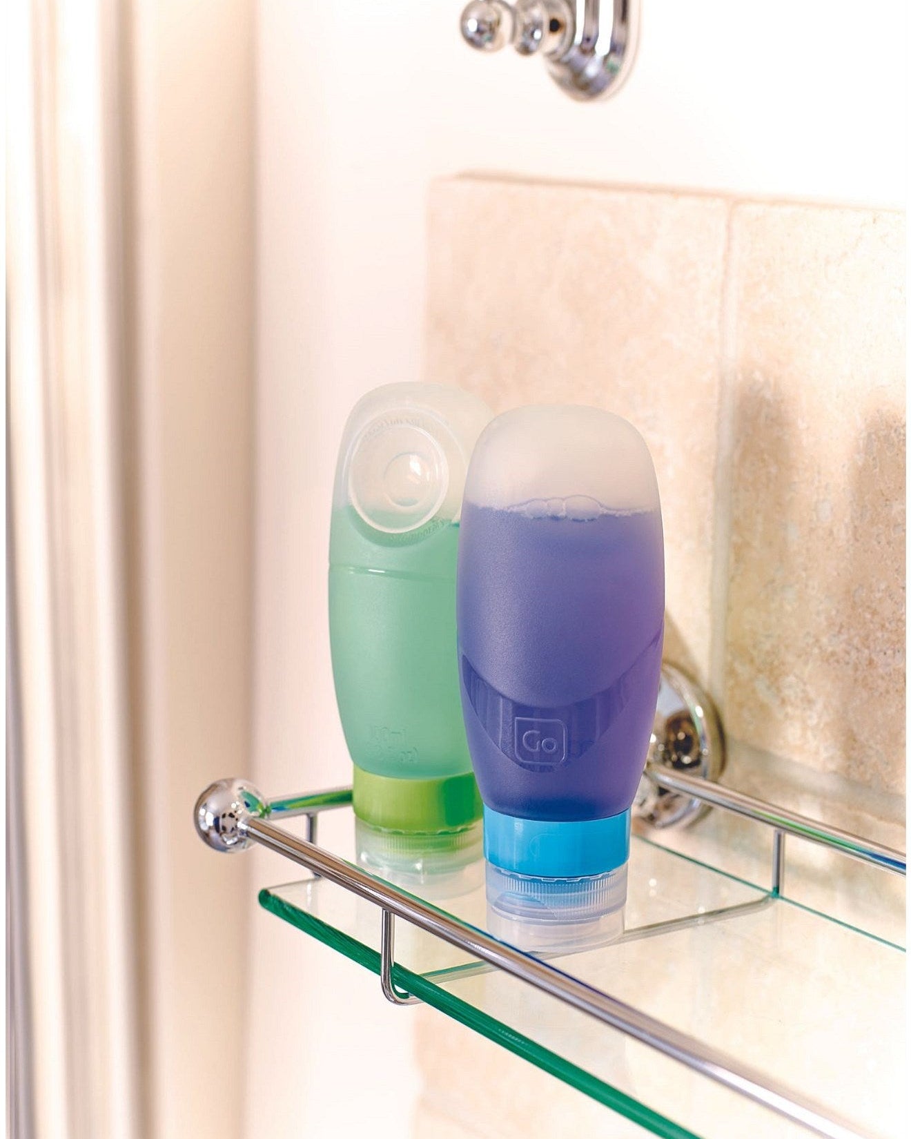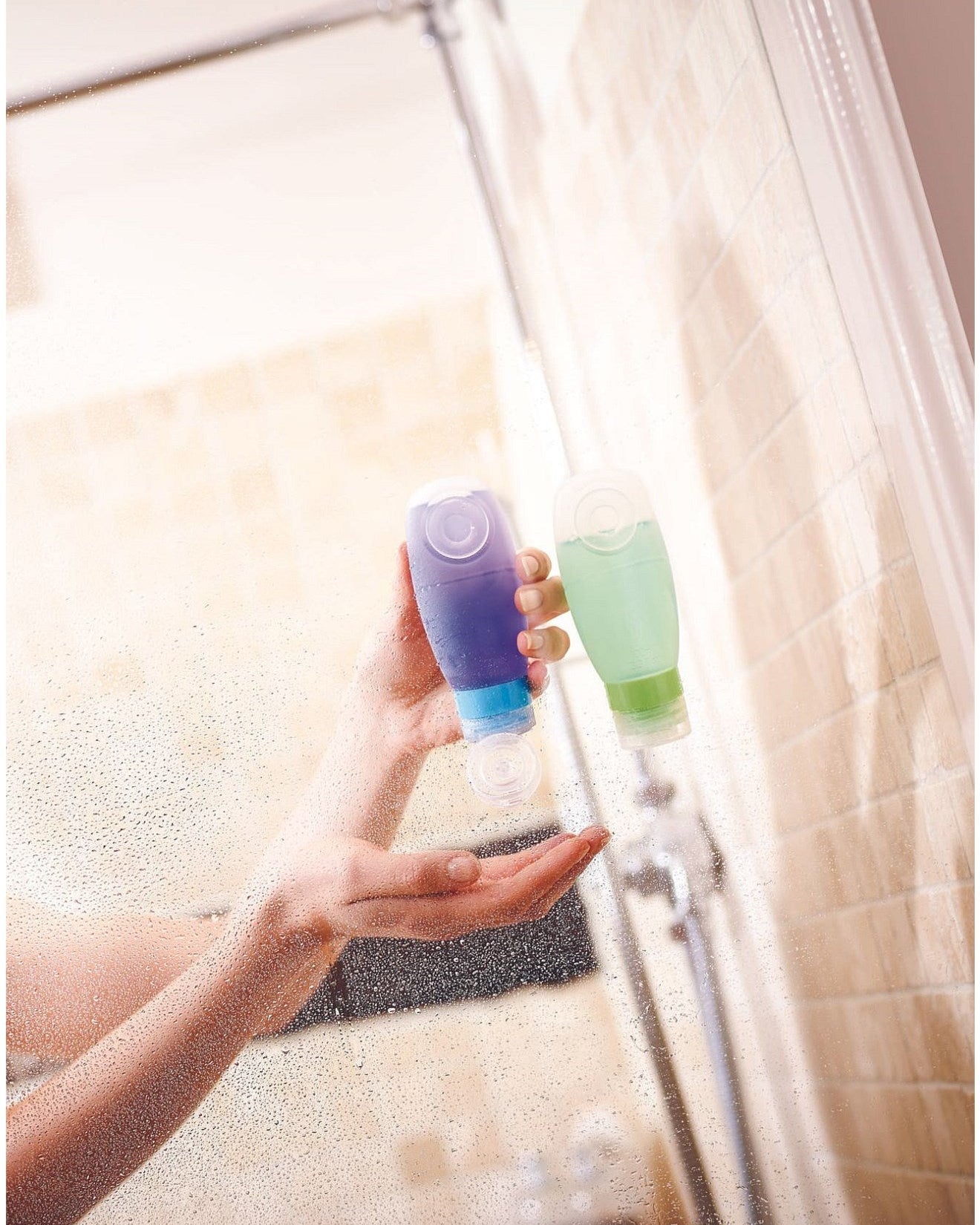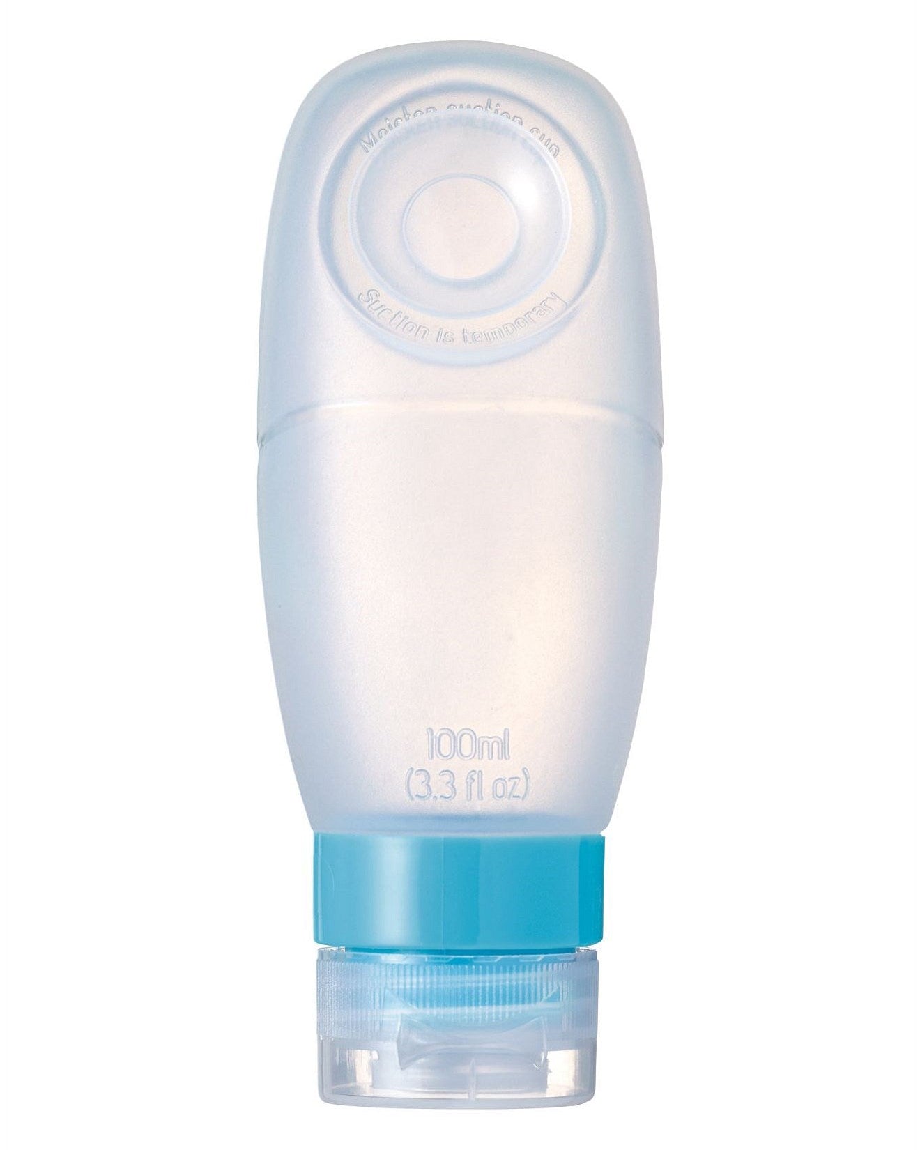A suction cup on the rear of each travel bottle enables them to attach instantly to any shower screen or tiled area, perfect for dispensing product hands-free