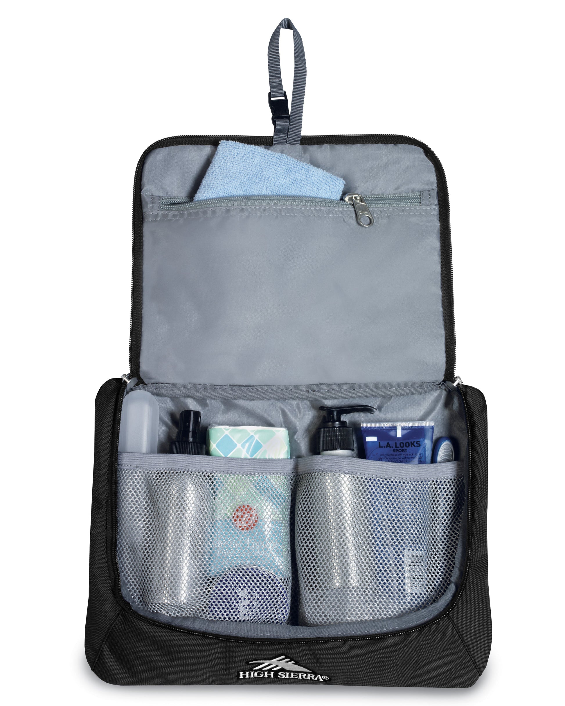 - Multi-pocket toiletry pouch hangs from a webbing loop.