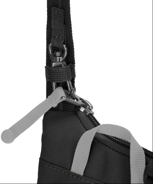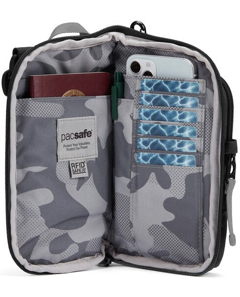 Keep your important belongings close to your body for stress-free travels. Designed to be sleek, this crossbody with built-in wallet can hide discreetly under a jacket. Keep your passport, boarding pass, credit cards, and cash in the main compartment, which can be locked using the simple zip clip. The quick-access front compartment is perfect for your phone and other essentials, and can be secured using the easy and fast zip tab. This product is made with post-consumer recycled polyester (rPET), equivalent to 4 recycled plastic bottles.