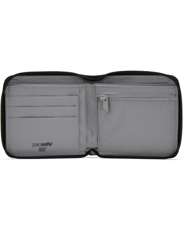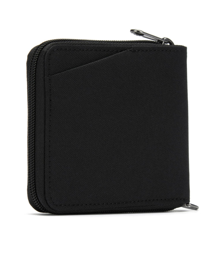Keep your cards and money in its place with an all-around zipper closure. This bi-fold wallet will protect your ID and credit cards against unwanted scans with RFID-blocking materials, but also includes a quick scan pocket for your transport cards for easy and fast transactions. Add a cut-resistant wallet strap (sold separately) to the D-ring attachment point on the wallet or use it to clip inside a Pacsafe bag for extra security.