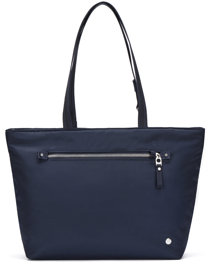 This spacious tote offers a refined, minimalist style, perfect for travel, work, or any situation requiring ample storage. Featuring a padded laptop compartment for secure tech storage, a luggage slip for easy transport, a front compartment for quick access, a spacious zippered RFID blocking pocket, various organizational pockets for your phone, pens, portable charger, and more. Discreet anti-theft features are integrated into the tote to provide you with peace of mind.