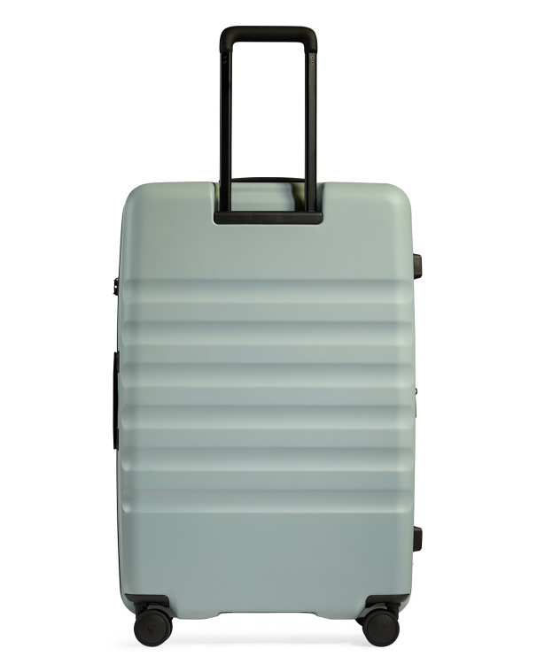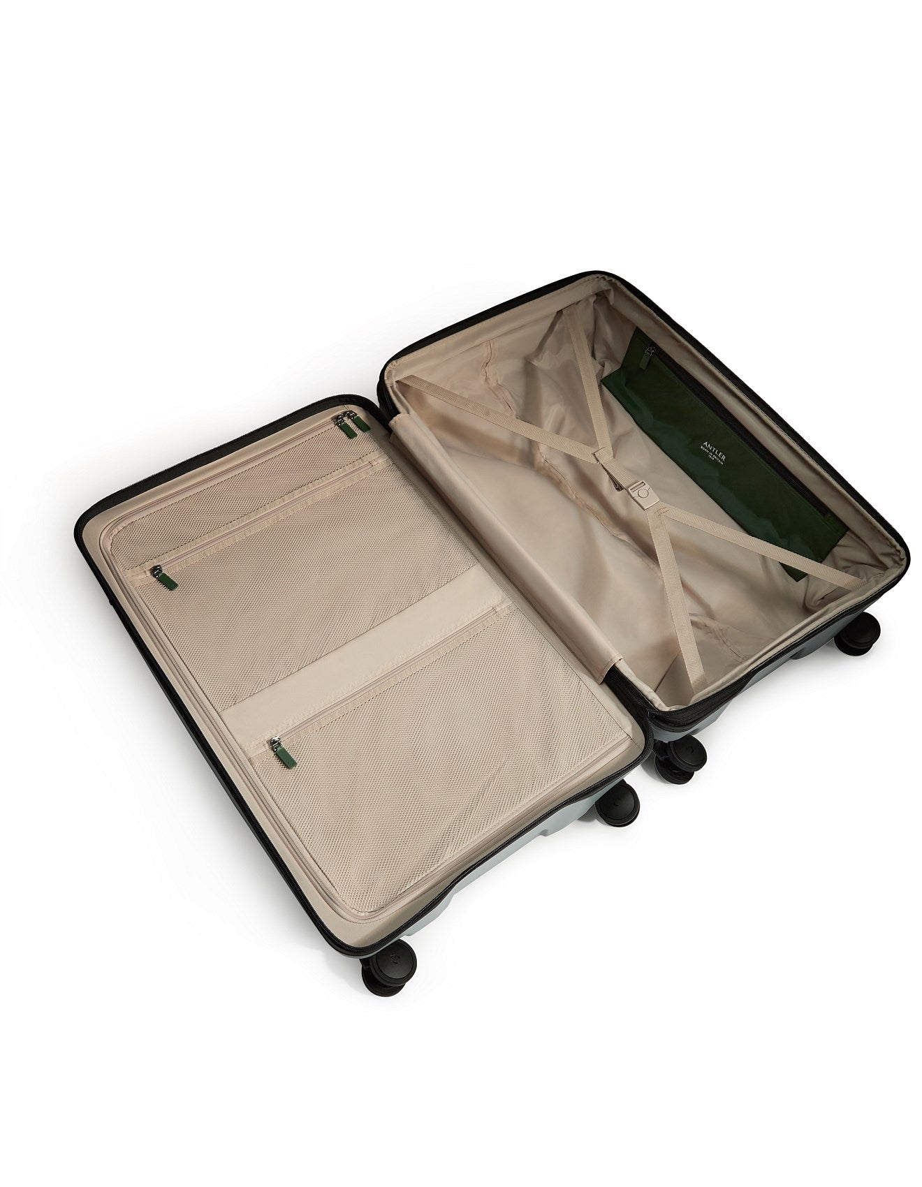Experience unrestricted movement with our design combination of Silent Glide 360 spinner wheels and bespoke comfort-grip handle. The compact yet spacious fully recycled interior lining, featuring double-zip pockets and compression straps, provides ample space for your belongings.