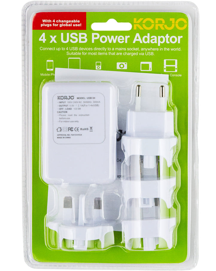 The Korjo USB Power Hub x4 is a clever way to charge up to four USB devices when travelling or at home. It has 4 interchangeable pin configurations, so that you can use it almost anywhere in the world.
