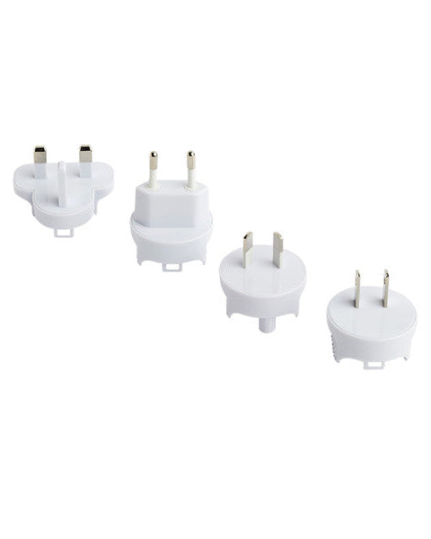 - Four interchangeable plugs included – AUS/NZ, EU, UK, US