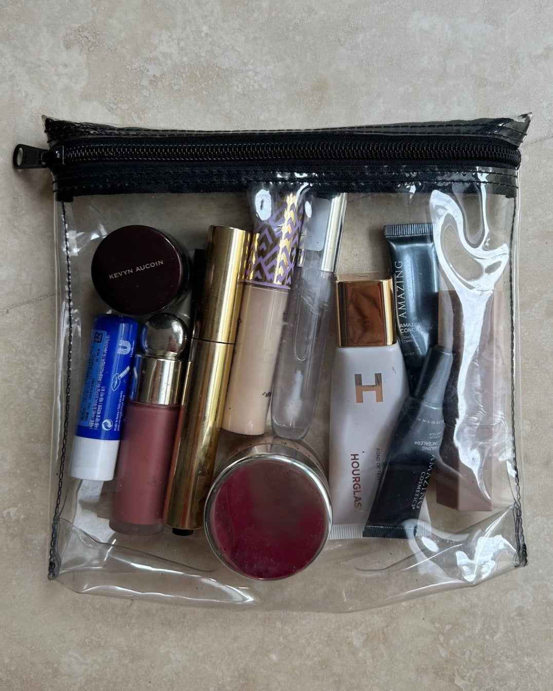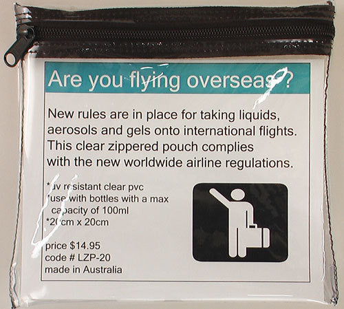 New rules are in place for taking liquids, aerosols and gels onto international flights. This clear zippered pouch complies with the new worldwide regulations