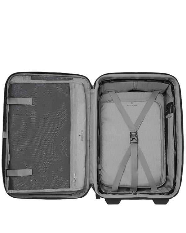 - Interior expandable packing cube with padded compartment for laptop, tablet or other small items offers optimum organization, removable garment suitor for wrinkle-free packing, compression straps and mesh zip pockets